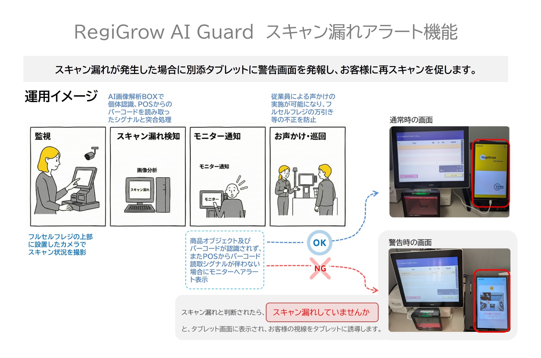RegiGrow AI Guard(レジグロー AIガード)機能によるスキャン漏れを検知・発報し、お客様への通知と啓発を行います。これにより利用客様による再スキャン実施を促し、未会計ロスの抑止に貢献します。