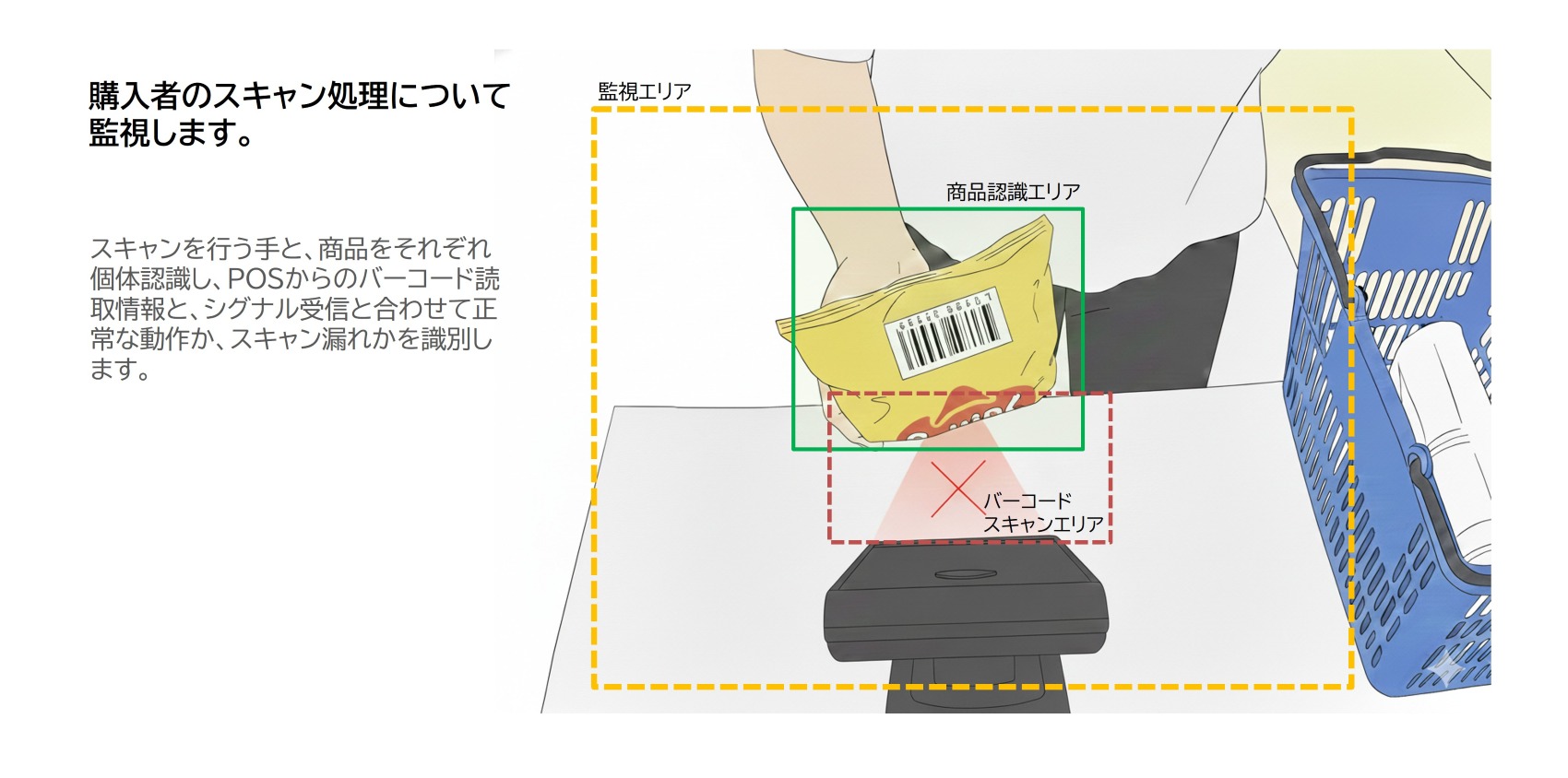 「見守るAI」が、店舗の利益とスタッフの笑顔を守ります。 スキャン漏れを瞬時に検知。